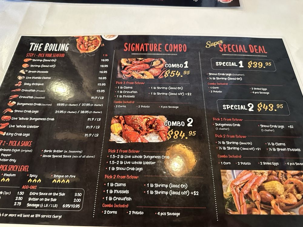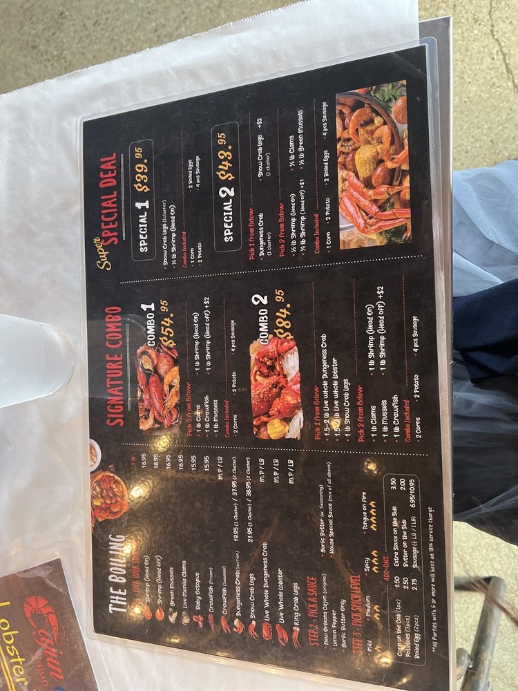 Snow crab legs 1 cluster. 1/2 lb shrimp head on. combo included 1/2 lb sausage, 1 corn, 2 potatoes, 2 boiled eggs.