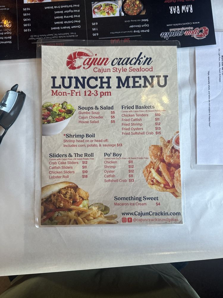 Introducing Cajun Crack'n, a Cajun/Creole seafood haven located at 275 Ranch Dr in Milpitas, CA. This trendy and casual spot offers a range of dishes perfect for lunch, dinner, or a late-night bite. Their menu features delectable sliders like Lobster Roll, Crab Cake, Catfish, and Chicken Sliders, as well as Po'Boys with options like Shrimp, Oyster, Soft Shell Crab, Catfish, and Chicken. To end your meal on a sweet note, indulge in their Macaron Ice Cream. The restaurant is wheelchair accessible, offers delivery and takeout, and has amenities like a full bar, outdoor seating, and catering services. Don't miss out on the flavors and atmosphere at Cajun Crack'n!